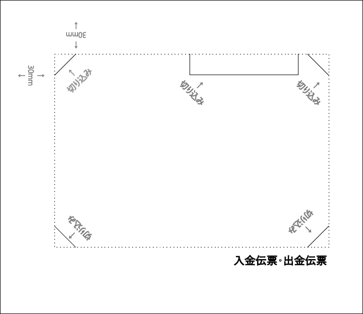 矢印の指示に従い、カッターで浅い切り込みを入れます。切り込みに伝票の角を軽く差し込み、ズレないように固定します。 切り込みを入れるのが手間な場合、市販の付箋のりで伝票用紙の四隅を固定しても大丈夫です。
