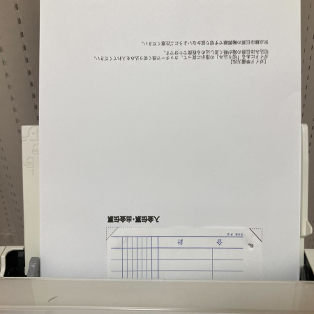 伝票をセットしたガイド用紙を、普段お使いの伝票と同じ給紙方向でトレイにセットします。給紙方向を間違えると大きくズレます。