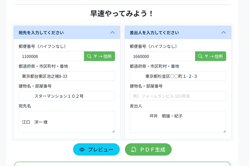 画面上のフォームに宛先・差出人を入力するだけ。12万件の最新データベースと連携しているため、郵便番号を入れるだけで住所が補完されます。