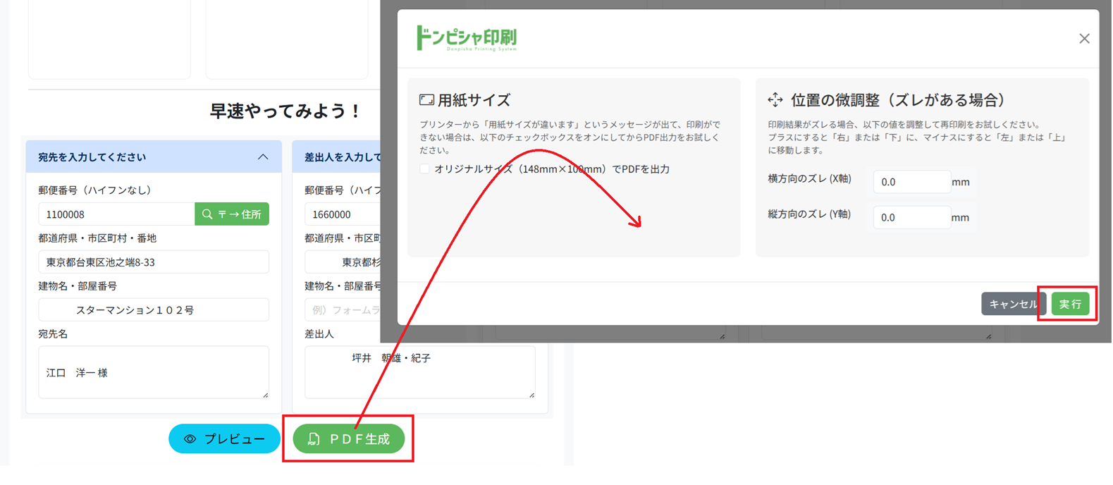 プレビュー画面で内容を確認して問題なければ「PDFを生成」ボタンを押します。「実行」ボタンを押すと印刷用のPDFが生成されます。プリンターのクセなどで印刷位置がずれてしまう場合は、位置調整をして再度実行してください。